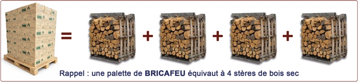 1 palette Bricafeu équivaut à 4 stères de bois sec (fendu et séché 2 ans sous abris)
